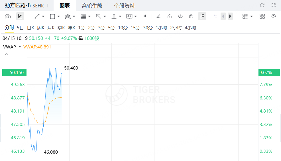4月15日,创新药概念股上涨,劲方医药-B涨超9%,信达生物涨超4%,恒瑞医药、石药集团跟涨。