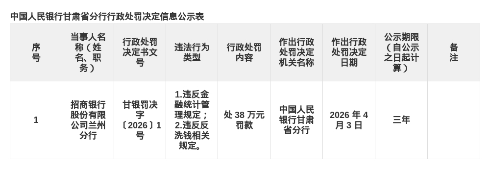 蓝鲸新闻4月13日讯,近日,中国人民银行甘肃省分行公布了行政处罚决定,剑指招商银行股份有限公司兰州分行。