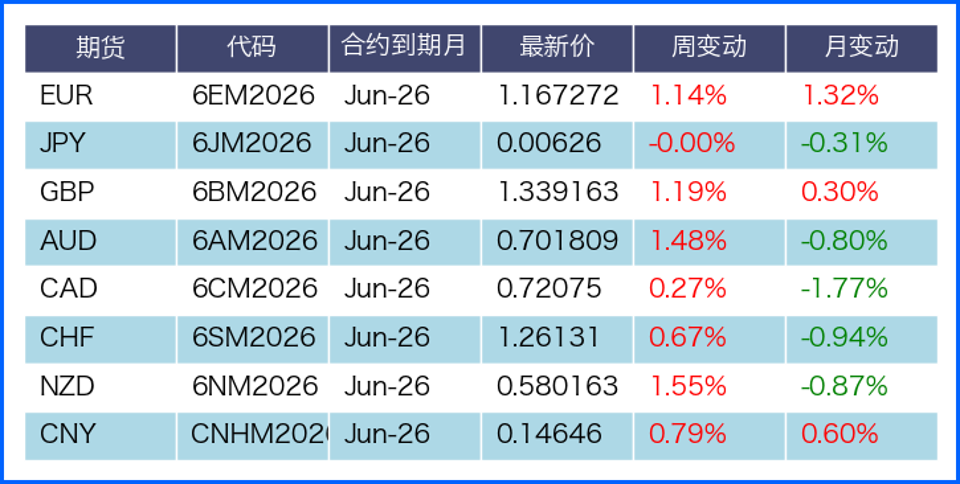 受到美伊达成停火协议后美元疲软走势支撑,欧元兑美元上周大涨1.77%。除美元疲软的主要因素外,欧洲央行政策定价偏黏性,也为欧元提供一定韧性,确保汇价在上周后半段美元指数的小幅反弹下依旧保持强势。不过尽管有一定韧性,地缘不确定性仍将制约欧元上行,短期汇价或维持区间震荡,等待更多数据指引。