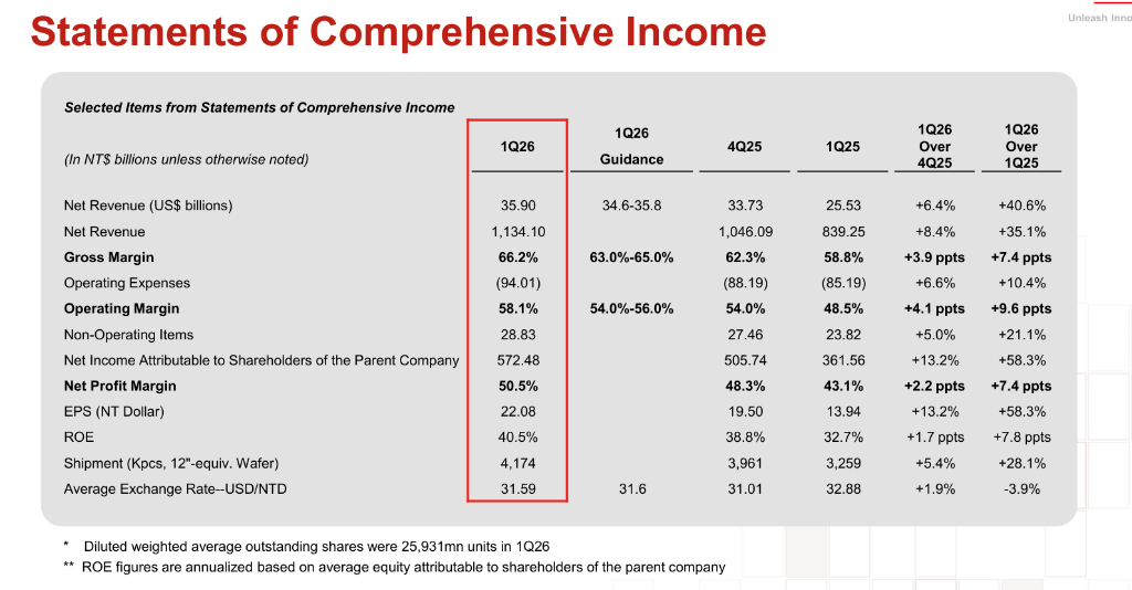 台积电同日公布的2026年首季业绩显示,Q1净利润达5725亿元新台币,同比增长58%,营收为1.134万亿元新台币,同比增长35%,毛利率飙升至66.2%。受AI需求提振,HPC平台贡献逾六成营收,3nm及5nm等先进制程占比升至74%。
