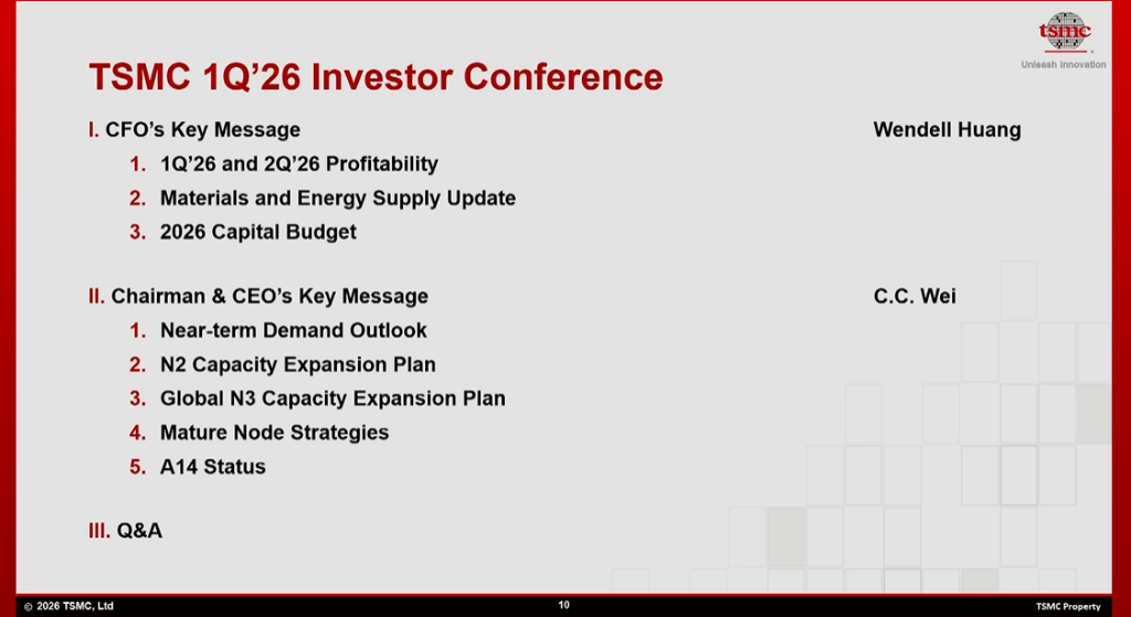 今天的会议流程如下:首先,台积电高级副总裁兼首席财务官黄仁昭(Wendell Huang)先生将总结我们2026年第一季度的运营情况,随后给出2026年第二季度的业绩指引。之后,黄先生和台积电董事长兼首席执行官魏哲家(C.C. Wei)博士将共同传达公司的关键信息。然后我们将进入问答环节。