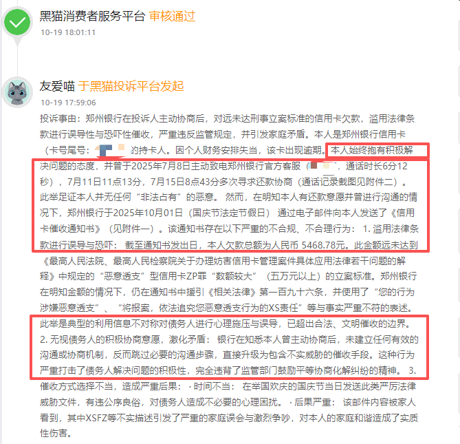 我们留意到去年10月份期间,有用户在黑猫投诉平台上反馈关于郑州银行信用卡涉及不当催收的问题。用户表示,其在郑州银行信用卡的欠款总额为人民币5468.78元,因个人财务安排失当,导致该卡出现逾期。不过,用户本人表示其始终抱有积极解决问题的态度,还曾主动和郑州银行寻求还款协商,并表示本人并无任何“非法占有”恶意。