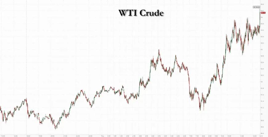一则来自彭博的重磅消息推动油价走高。国际基准布伦特原油6月合约大涨近5%,收于99.39美元/桶;美国WTI原油5月合约上涨近4%,报94.69美元/桶。