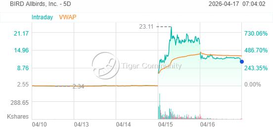 4月16日周四,“硅谷足力健”Allbirds大幅下挫近36%,盘后继续下挫超6%。此前因转型人工智能基础设施,周三股价狂飙逾582%。