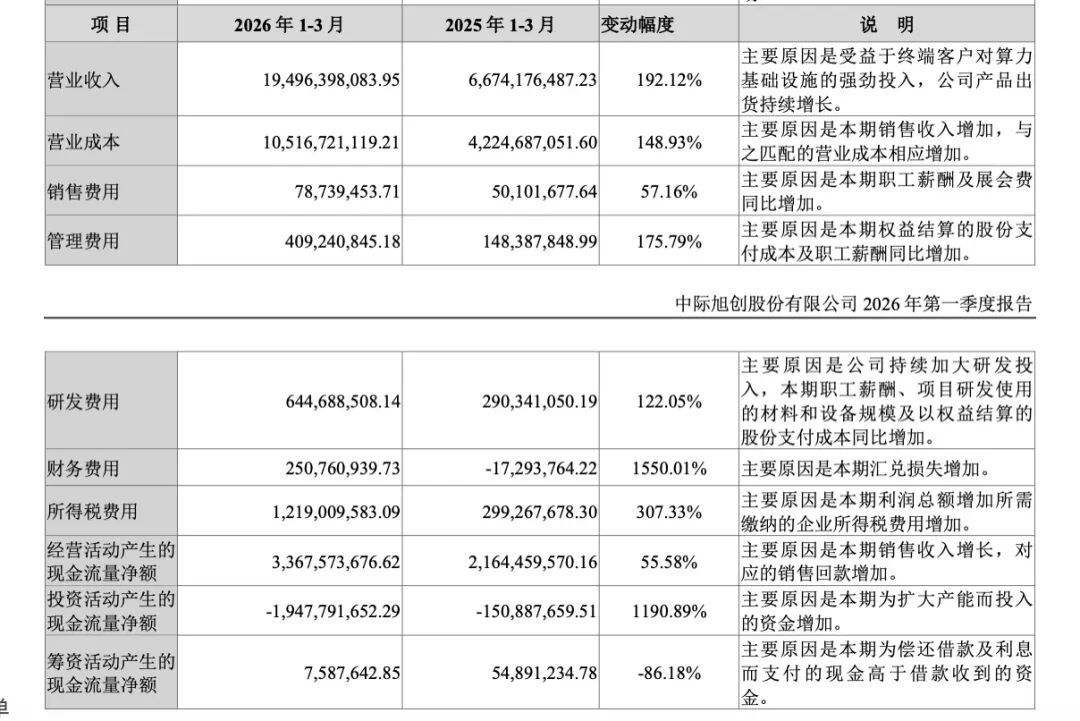 4月16日晚,中际旭创2026年Q1财报出炉:营收194.96亿元,同比暴增192.12%;归母净利润57.35亿元,同比狂涨262.28%。