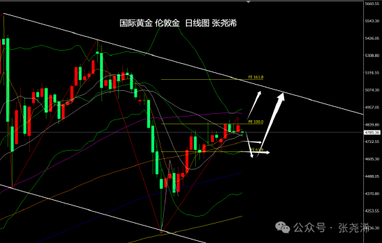 周图级别,金价上周继续反弹收涨,但仍未突破10周均线阻力,令后市仍具有调整回撤至4450美元附近的风险,如突破10周均线阻力收阳,则有望再度刷新历史高点。而本周下方也有中轨和5周均线支撑,故此,目前回撤触及中轨或5周均线,则仍先看涨入场为主。