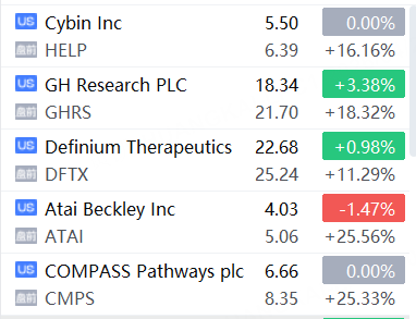 其中,Compass Pathways、Atai Beckley涨超25%,Definium Therapeutics、GH Research、Cybin均出现大幅上涨。