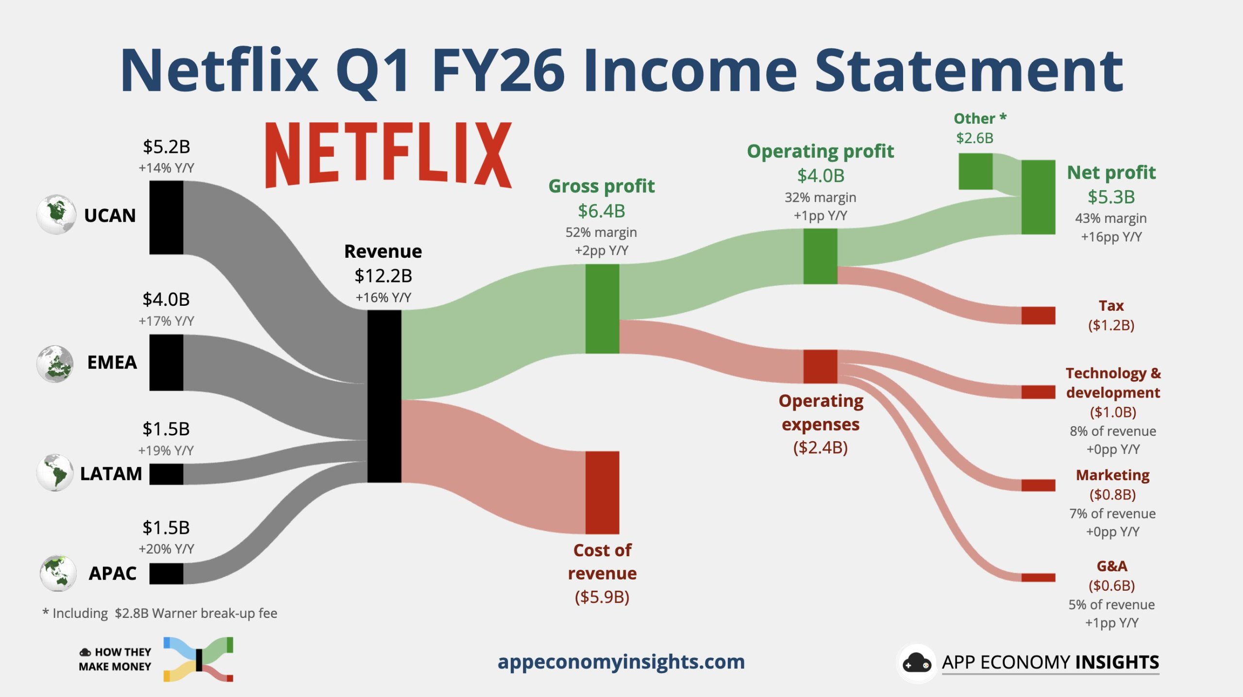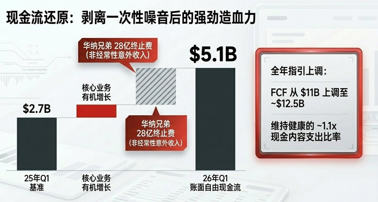 奈飞一季度净利润同比增长81.7%至52.8亿美元,远高于营业利润水平,主要来自“利息及其他收入”录得28.5亿美元,管理层明确指出,这其中包含与华纳兄弟交易相关的28亿美元终止费。换言之,这是奈飞在结束竞购华纳兄弟资产后收到的“意外之财”。