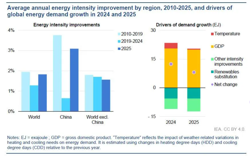 相比之下,全球整体能源需求增速仅为1.3%,略低于过去十年1.4%的均值,受全球经济增速放缓、能源密集型产业增长趋弱及能效提升加快等因素拖累。