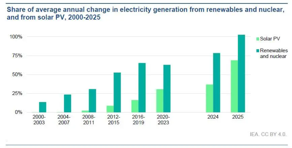 可再生能源与核电合计增量已超过全球电力供应总增量,可再生能源总发电量目前几乎与全球煤电总量持平。在欧盟,太阳能与风能合计发电占比2025年达30%,首次超越化石燃料。