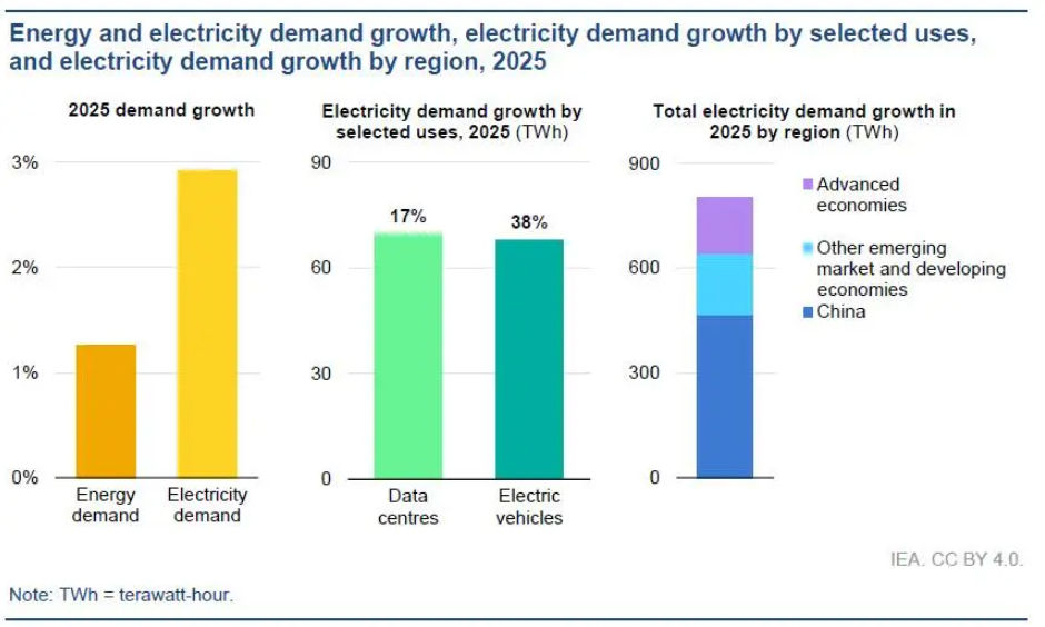 2025年全球电力需求增速为3%,高于2014年至2024年间2.8%的年均水平,但低于2024年的4.4%。IEA将增速回落主要归因于印度和东南亚降温需求下降等一次性因素,而非结构性趋势逆转。