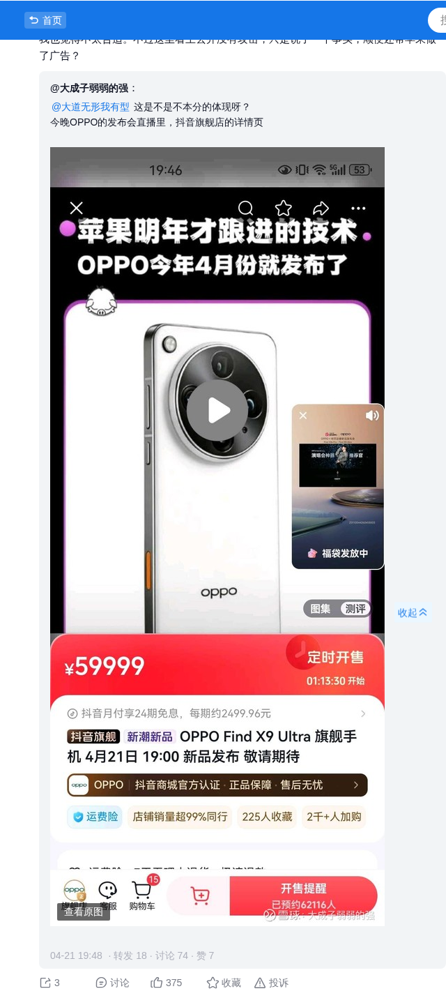 今晚OPPO的发布会直播里,抖音旗舰店的详情页