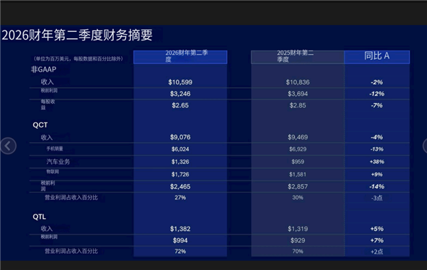 本季度高通GAAP营收为106亿美元,同比下降3%;非GAAP营收同比下降2%,基本与市场预期持平。