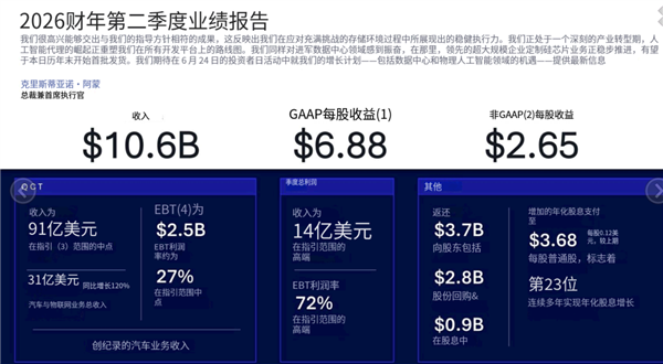 本季度公司总营收106亿美元,非通用会计准则每股收益2.65 美元,整体表现符合预期。其中汽车与物联网业务保持强劲增长,彰显出公司多元化战略的显著成效。
