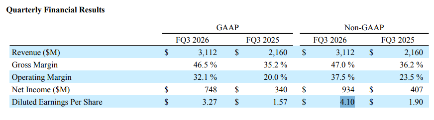 在截至4月3日的2026财年第三财季,希捷总营收约31.1亿美元,同比增长44%,超出华尔街分析师们平均预期的29.6亿美元。NON-GAAP准则下的调整后每股收益4.10美元,较上年同期的1.90美元可谓大幅增长,且大幅超过市场预期的3.51美元。GAAP每股收益为3.27美元,上年同期则为1.57美元。NON-GAAP毛利率达到47%,较上季度提升480个基点;NON-GAAP营业利润率扩张至37.5%,较上季度提升560个基点。