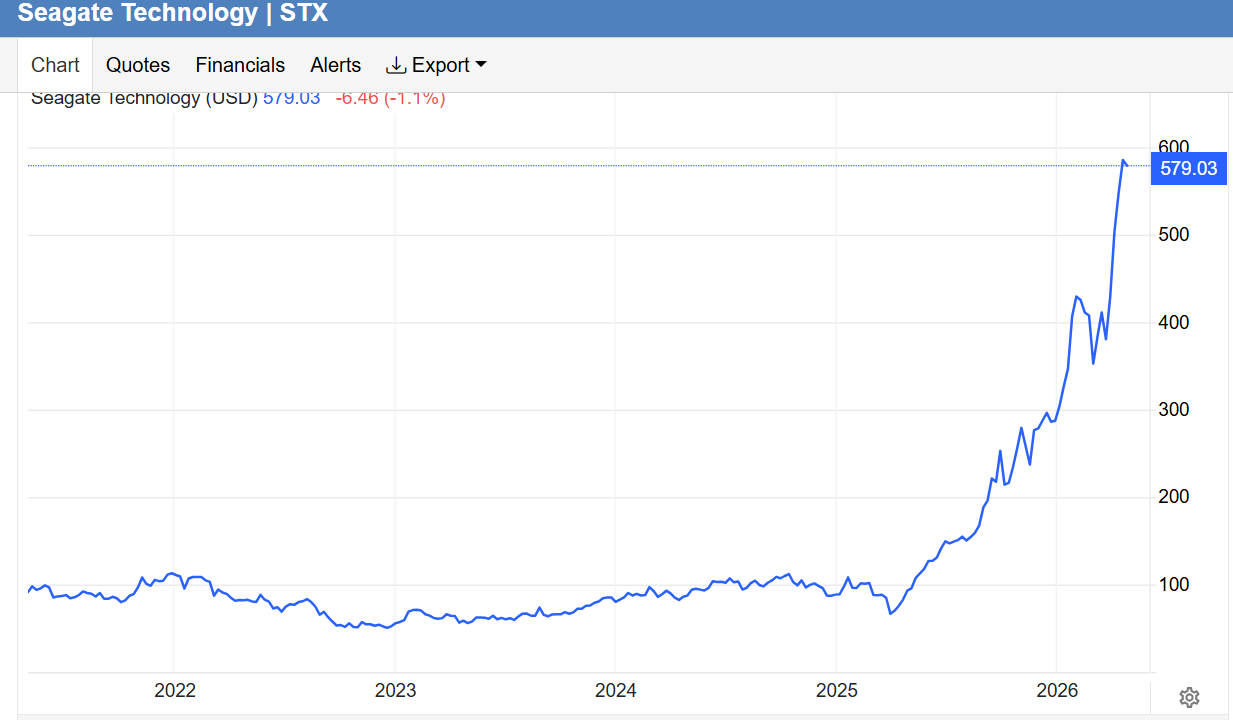 在最新的季度业绩报告发布前,希捷股价今年以来已经上涨逾110%。全球SSD存储产品领军者闪迪股价自2026年初以来则可谓暴涨超300%大幅跑赢全球股市基准指数,总市值一度接近1600亿美元。在整个2025年,闪迪股价涨幅高达惊人的580%,今年在AI基建狂潮带来的近乎无止境存储芯片需求推动之下,仍在上演“全球存储芯片神话”般的史诗级涨势,乃全球股市毋庸置疑的AI算力基础设施主题“超级大牛股”。