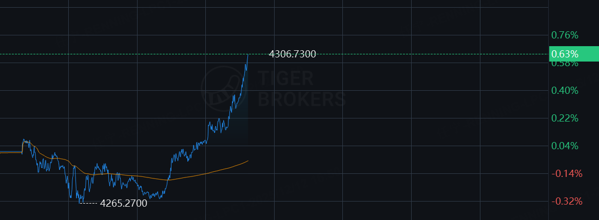 週五,現貨黃金快速拉昇,向上突破4300美元,為10月21日以來首次,已連續四天走高。