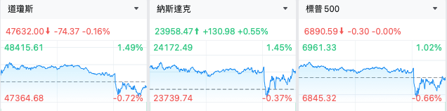 週三,美股三大指數升跌不一,道指標普高位回落,納指再創歷史新高。截至收盤,道瓊斯指數跌0.16%,報47632點;標普500指數跌0.3點,報6890.59點;盤中兩隻指數一度刷新高,但在聯儲局主席鮑威爾講話後明顯回落。