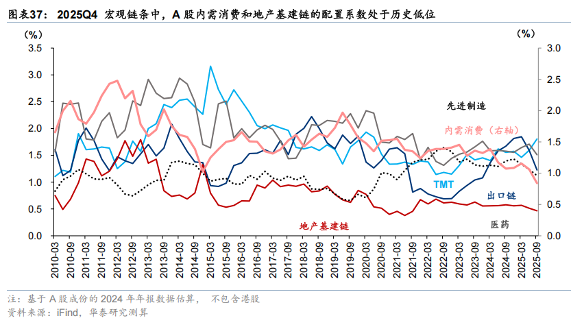 內需鏈籌碼集中度低。從4Q25的公募配置係數看,A股TMT配置係數分位數位於70%以上的相對高位,先進製造配置係數分位數位於中樞位置,內需消費、醫藥、地產基建鏈產業鏈配置係數分位數均位於10%以下的低位,其中內需消費配置係數分位數僅為0%,籌碼出清程度較高。