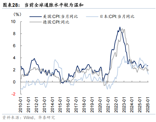 1)當前全球總體通脹水平低於70年代第二次石油危機和2022年俄烏衝突前的起點。2026年2月,美國、日本、德國CPI按年增速分別為2.4/1.3/1.9%。相比之下1978年10月石油危機前上述三國通脹水平8.9/3.7/2.4%,且由於剛經歷過第一次石油危機的陰影,通脹預期也處在高位;2022年1月俄烏衝突前,美國、日本、德國CPI按年增速同樣高達7.5/0.5/4.2%。