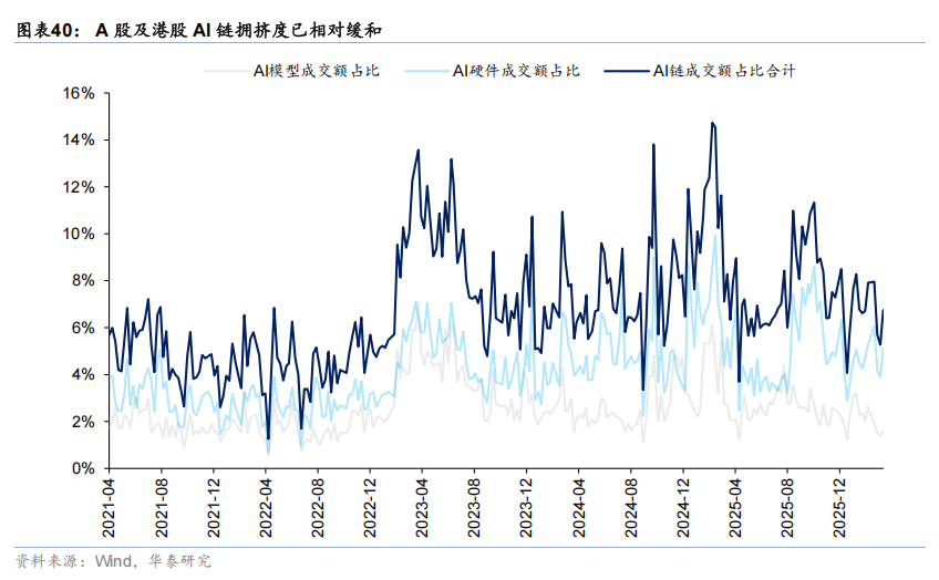 AI板塊近期分歧加大,波動幅度放大。從短期視角看,由於AI尤其是硬件擁擠度偏高,且全球AI上漲趨勢「火車頭」美股相關公司穩定性下降,再加之流動性壓力、電力價格上升和部分生產環節可能受阻等負面影響,短期或受一定衝擊。但從產業側看,AI進展依然延續,且應用普及率不斷上升,產業發展本身並未中斷。在當前交易定價至第二階段時,AI鏈有望再度跑贏。