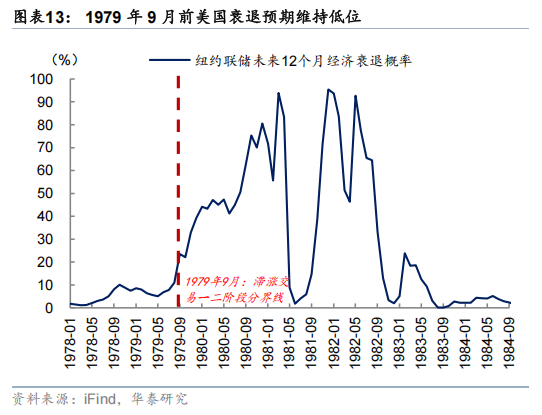 以1970年代中後期的滯脹交易為例,對通脹的交易發生在1978年10月至1979年9月。1978年10月伊朗反對沙阿政權的示威浪潮持續升溫,11月石油工人集體罷工更使伊朗石油產量驟然銳減。由於此前美國通脹已經升溫,且經歷過70年代初的高通脹,市場擔憂高通脹壓力捲土重來,通脹預期快速走高。在這一背景下,標普500從1978年10月11日起持續回落,歷時34個交易日,回撤幅度達12.24%。1978年11月,卡特政府聯合主要盟國大規模干預外匯市場,並將貼現利率一次性上調100bps,政策精準擊中市場核心擔憂,悲觀預期迅速逆轉。儘管通脹預期與實際通脹仍持續上行,但1979年9月之前,美國衰退預期始終維持低位,銅價從1978年9月的1442美元/公噸持續攀升,至1979年9月已升至2096美元/公噸,漲幅達45%;黃金價格從217美元/盎司持續攀升至397美元/盎司,漲幅達47%;金銅比維持穩定,反映工業需求預期仍具韌性,市場對經濟前景的信心並未動搖,企業盈利增長仍然強勁。這一階段市場的主流敘事仍是"供給側的暫時性擾動",而非系統性衰退的前兆,美股在"通脹抬頭"與"增長免疫"的並存中延續上行趨勢。