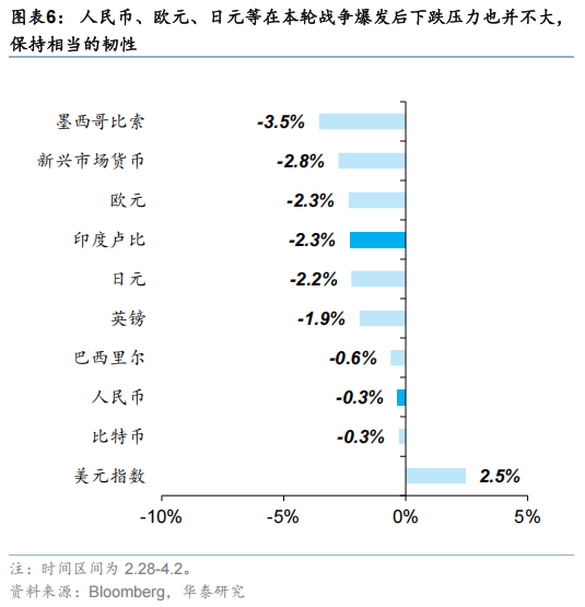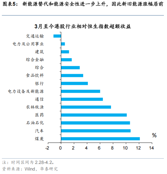 從長期結構性問題上,市場在同步定價當前衝擊帶來的長期格局變化。1)新能源替代和能源、糧食等安全性進一步上升,因此市場中新舊能源一起上漲。截止4月2日,煤炭、石油石化等傳統能源板塊,與汽車、電新這一新能源板塊,在港股市場中均漲幅居前。2)去美元化會延續而不是逆轉。因此雖然短期流動性壓力導致美元指數衝高,但僅僅上升2.1%的程度並不大,尤其是相比歷史上地緣衝突時的資金大規模流入美國避險的情形(如俄烏衝突爆發後3個月美元升值6.2%)。其他主要貨幣例如人民幣、歐元等在本輪下跌壓力也並不大,保持相當的韌性。