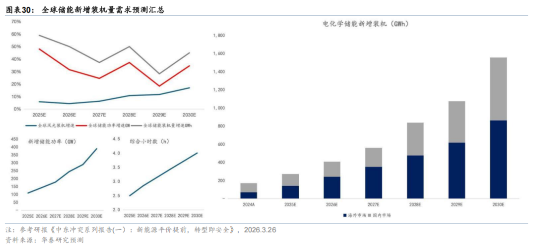 參考華泰電新團隊測算(中東衝突系列報告(一):新能源平價提前,轉型即安全,2026.3.26),鋰電產業同時受海外乘用車電動化、國內商用車電動化、儲能需求增長三重因素驅動,帶動板塊共振向上。1)海外乘用車:高油價強化電動車經濟性,滲透率加速提升。2026年越南、印尼、印度、馬來西亞電動化率提升至40%、20%、10%、10%,按年增加8、6、7、6個百分點,對應電池需求按年增長22.8GWh。2)國內商用車:電動化觸及平價拐點,打開應用場景電動化替代增量空間。在短途高頻運輸(短倒運輸、工程用車等)場景中,油價上行正加速電動重卡與柴油車實現經濟性平價,預計2026年國內商用車將新增99.7GWh動力電池需求。3)儲能:電池需求第二曲線逐步顯現。在全球能源價格波動加劇、天然氣推升電價中樞背景下,儲能經濟性有望改善,進一步放大鋰電板塊整體景氣度。