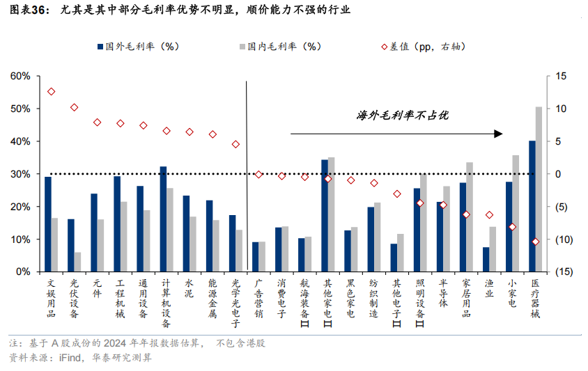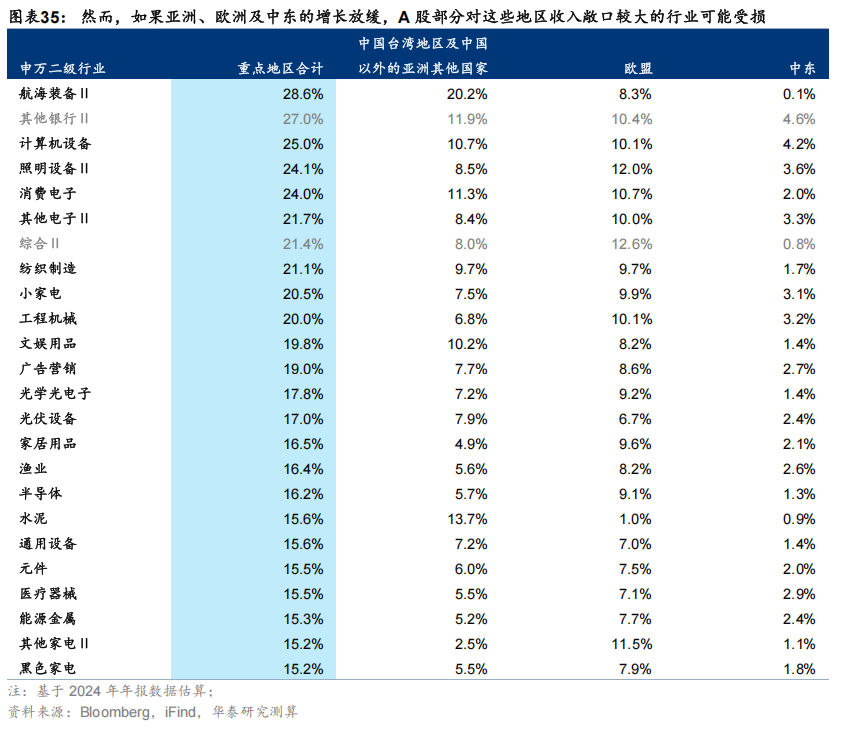 消費電子、紡織品、家電等可選消費品受到的負面衝擊可能更大。我們認為,滿足以下三個條件的行業受到負面衝擊的風險相對大。第一,在重點地區(亞洲除中國、歐盟及中東)的收入敞口大(2024年年報>15%);第二,可選屬性強,原材料成本敏感度高;第三,海外毛利率沒有優勢,換而言之,在海外的順價能力並不強。上述篩選對應更可能承壓的行業包括消費電子、家電(黑電、小家電)、紡織製造以及家居用品。