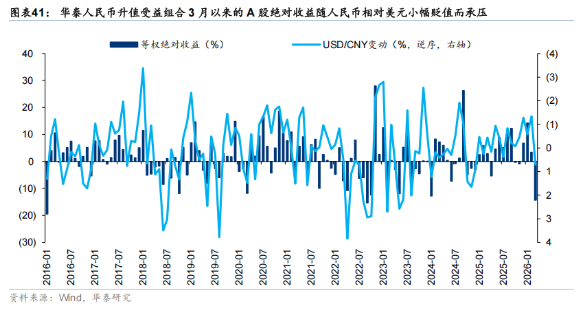 近期美元走強拖累,人民幣相對美元出現了小幅貶值,但中期看人民幣升值趨勢不變,能源金屬等升值受益品種可逢低吸籌。在美元指數走強的背景下,人民幣近期相對美元小幅貶值,我們的人民幣升值組合自3月以來承壓。但從更長的視角看,我們認為,地緣風險和油價上行風險的衝擊可能使得人民幣升值的斜率放緩,但考慮到其相對中國的強貿易順差仍被明顯低估,中期的升值趨勢不變。且目前的地緣衝突反而在中長期視角進一步加速去美元化和人民幣國際化的趨勢(《中東局勢如何影響香港資本市場重估》,2026/3/28)。因此,對於AH有色、A股部分中游材料和製造(如電池等)以及香港本地股等人民幣升值期間表現較好的受益品種,仍有逢低吸籌機會。