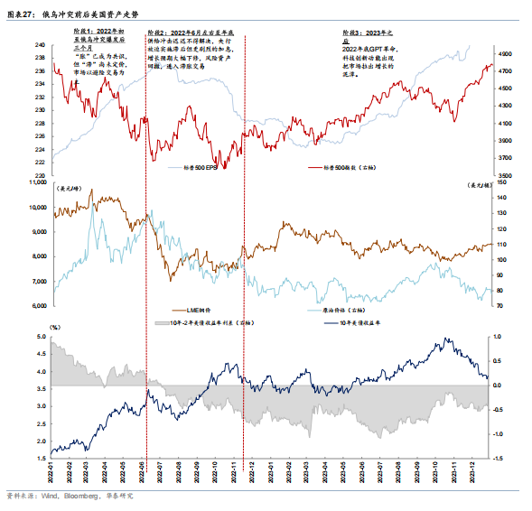 2022年類似,俄烏衝突爆發初期,美國經濟「脹」已成為共識,但「滯」尚未定價,市場以避險交易為主。2022年在俄烏衝突發生後,全球大宗商品價格急劇飆升,原油在兩周內飆升超過35%。銅價短期也大幅上漲7%,反映出市場對俄羅斯供給中斷的恐慌性定價。股市因風險偏好下降而調整,標普500從2月25日至3月8日回撤約4.9%(若從年初高點算,累計回撤約13%),但隨後市場迅速反彈11%修復前期失地。市場普遍依據歷史經驗認為,這屬於典型的「事件驅動型」波動,地緣衝突對全球增長的衝擊是短期的、局部的(主要影響歐洲),不會改變美國經濟的中期趨勢,因此標普500的盈利預期並未出現下修。這一階段,聯儲局強化了市場的樂觀態度。在2022年3月的議息會議上,聯儲局雖然大幅上調了通脹預測(PCE從2.6%上調至4.3%),但將經濟預測僅從4.0%下調至2.8%,並維持失業率預測在3.5%的低位預期,市場彼時認為聯儲局有足夠的工具在壓制通脹的同時不傷及就業,因此美國經濟衰退預期(滯)並未系統性上修,定價重心完全放在通脹和加息節奏上。