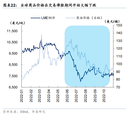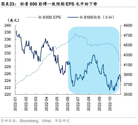 銅價走低、利率倒掛、股市盈利明確下修。LME銅價從6月初的約9700美元/噸暴跌至7月中的7000美元/噸,下跌近28%。銅價的崩盤標誌着市場從「交易通脹」全面轉向「交易衰退」。美國長短債利差在7月後持續深度倒掛,10月時已達到-0.37%,美國經濟衰退預期成為市場共識。盈利預期在這一階段開始出現明確的下修。標普500一致預期EPS在7月達到峯值後開始回落。疫情期間大幅擴張的科技企業紛紛啓動裁員,Meta、Amazon、Twitter等公司相繼宣佈大規模裁員計劃,美股也經歷了深度回撤。標普500從8月中旬的4305點後再次掉頭向下,最終在10月12日觸及3577點的年內低點,較年初高點累計下跌25.4%。納斯達克全年跌幅更是達到33%。