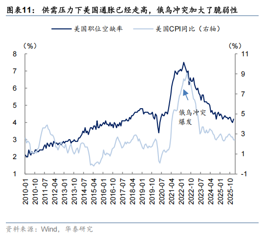 2022年也是類似的情況,在俄烏衝突前,美國消費需求大幅增長,通脹壓力已持續積聚。經濟層面,大規模財政刺激反而導致需求異常旺盛。為應對2020年新冠疫情對經濟的衝擊,以美國為代表的主要經濟體實施了史無前例的大規模財政刺激和超寬鬆貨幣政策,導致全球需求快速反彈並異常旺盛。然而,供給側的恢復卻嚴重滯後。疫情反覆導致全球供應鏈關鍵環節持續中斷,港口擁堵、集裝箱短缺等問題愈演愈烈,推高了生產和運輸成本。後期疫情限制措施移除後服務性需求也報復性上升,但勞動力供給卻遲遲受限。供需壓力下美國通脹已經走高,俄烏衝突加大了脆弱性。美國通脹從2021年初便開始顯著上升,到2021年底,美國CPI按年漲幅已突破7%,創下近40年新高。新冠疫情引發的全球供應鏈紊亂尚未恢復,而2022年突如其來的俄烏衝突在極端的供需結構進一步推升通脹。
