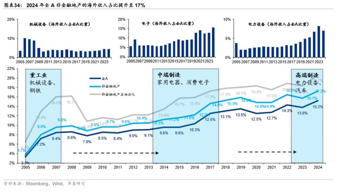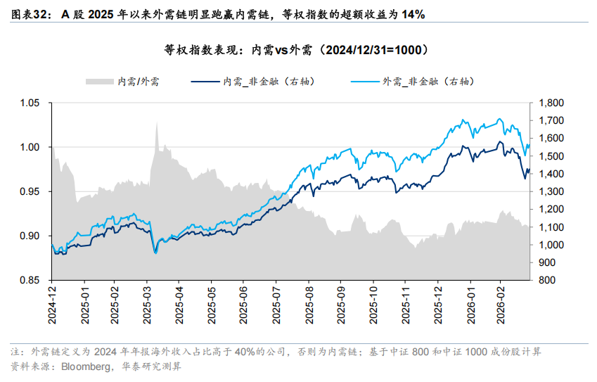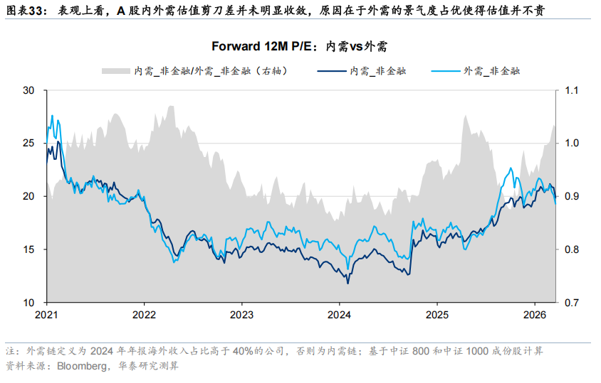 從估值上看,雖然過去外需鏈持續上漲,但相對內需鏈並不算貴,根本原因在於景氣度佔優。表觀上看,外需鏈相對內需鏈並不貴,尤其是在經歷了去年10月以來的相對估值修復後,當前A股內外需鏈的Forward P/E接近平價。但是需要注意的是,這種性價比建立在中國資產海外收入佔比提升、外需鏈相對內需鏈盈利優勢擴張的趨勢能夠延續的前提下。