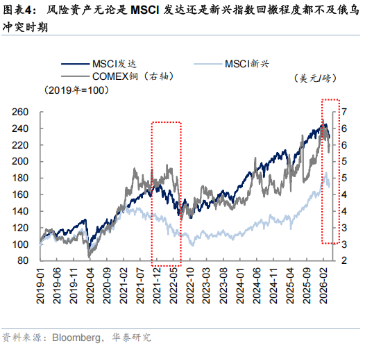 從周期性影響,也就是流動性衝擊、通脹和增長這三個問題看,1)目前的流動性壓力已經在逐步釋放,如黃金市場中投機性淨多頭倉位相比2月高點已經下降10.0%。2)對通脹上升定價在油價100美元,如美債1年期盈虧平衡通脹率明顯走高至5.2%;10年美債高點走至4.5%,都已超過我們此前在油價中樞100美元假設下的測算點位(《高油價下的「贏家和輸家」》,2025.3.9)。3)部分但並未完全定價增長下行,具體體現為工業金屬如銅價開始走弱但程度不深,銅與黃金比價反而從3月初至今提升超10%;10年-2年美債利差雖相比2月收窄10bp,但距離倒掛仍有50bp的距離;風險資產無論是MSCI發達還是新興指數回撤程度都不及俄烏衝突時期,且下跌主要由估值貢獻,盈利尚未持續性下修。