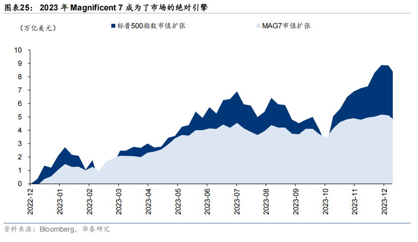 2022年底ChatGPT的出現驅動Mag7反彈,幾乎貢獻了2023年美股的所有漲幅。2022年11月30日,OpenAI發布ChatGPT,這是改變美國市場軌跡的「黑天鵝」事件。它打破了宏觀對市場的影響,開啓了由科技創新動能主導的新邏輯。市場不再糾結於當下的高利率,而是上修遠期盈利預期。AI被視為繼互聯網後的又一次生產力革命,賦予了美股科技巨頭極高的成長溢價。Magnificent 7(蘋果、微軟、英偉達、特斯拉等)成為了市場的絕對引擎。數據顯示,自ChatGPT發布至2023年底,標普500約62%的漲幅由AI相關巨頭貢獻;2023年全年,這七家公司市值增加超5萬億美元,幾乎以一己之力抵消了2022年的熊市跌幅。從長久期的角度來看,無論是上世紀70年代末的PC,抑或是2022年底的GPT革命,科技創新動能出現終究把市場拉出增長的泥潭。