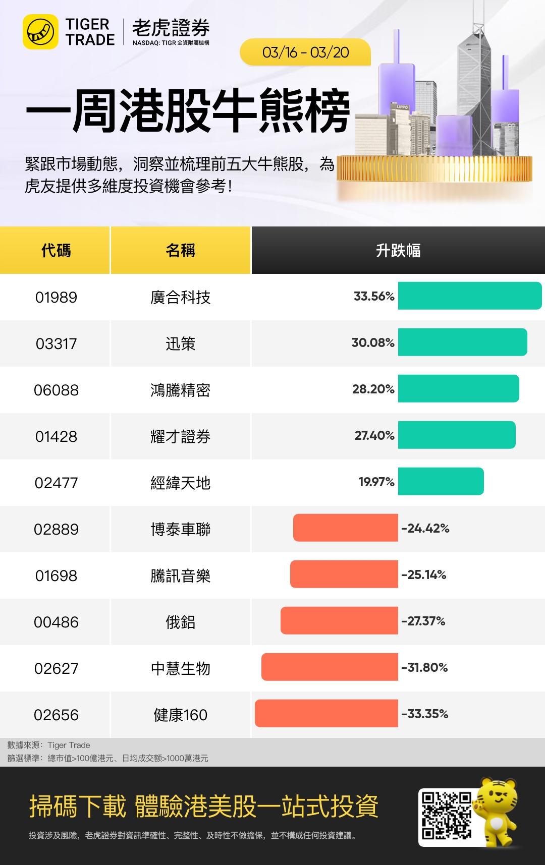 表現最好五隻股票是:廣合科技、迅策、鴻騰精密、耀才證券、經緯天地(市值百億以上、日均成交千萬以上);
