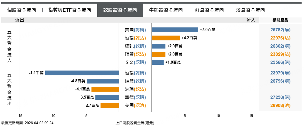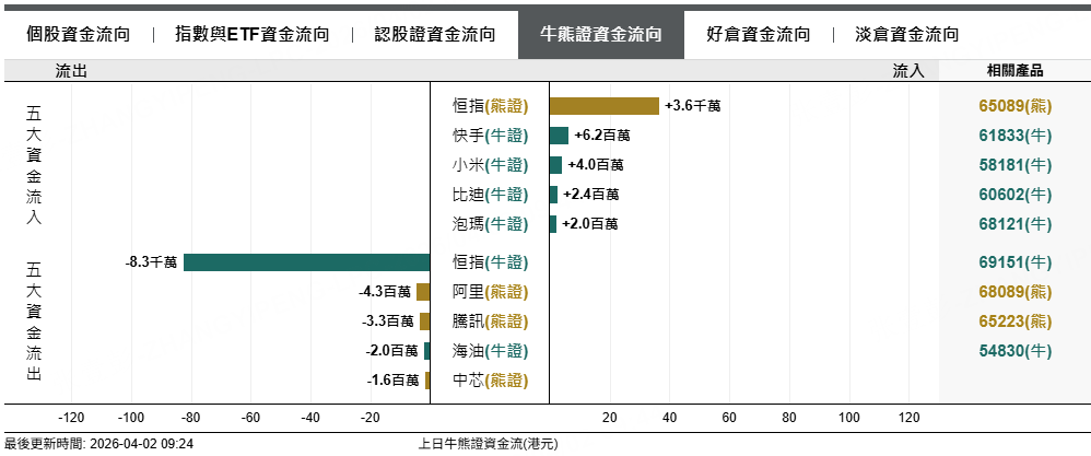 恒指熊證上日淨流入3600萬元,快手牛證淨流入620萬元;