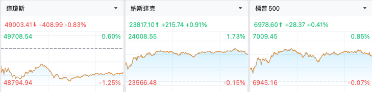 周二(1月27日),美股三大指數升跌不一。截至收盤,標普500指數漲0.41%,報6978.60點;納斯達克綜合指數漲0.91%,報23817.10點;道瓊斯指數跌0.83%,報49003.41點。