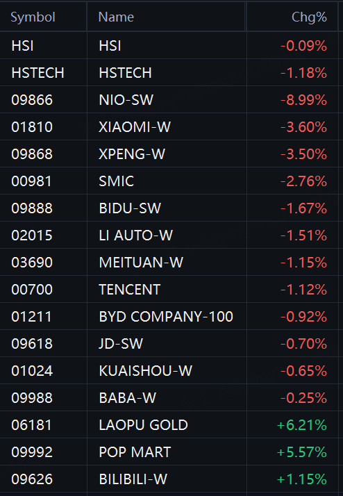 In terms of star stocks, NIO fell 9%; Xiaomi and XPeng fell 4%; SMIC fell 3%; Baidu and Li Auto fell 2%; Meituan and Tencent fell 1%; Alibaba fell 0.3%; while Laopu Gold and Pop Mart rose 6%; Bilibili rose 1%.
