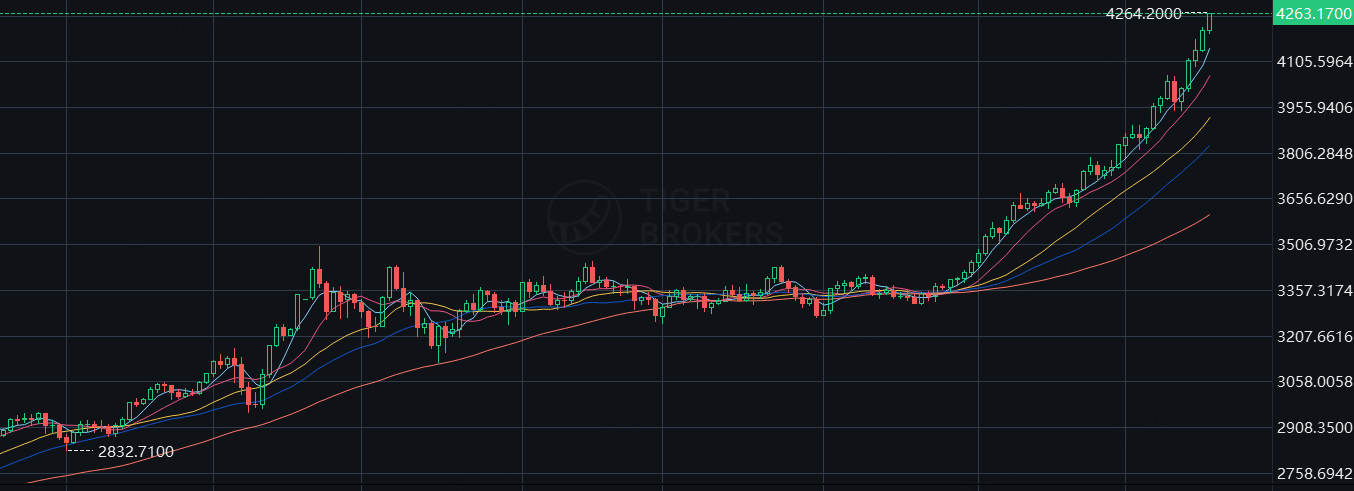 週四,現貨黃金站上4260美元/盎司,再創歷史新高!現貨白銀亦逼近歷史高位。概念股普漲,金田漲近4%, AngloGold Ashanti Ltd ADS 漲超3%,科爾黛倫礦業、哈莫尼黃金漲約2.7%。