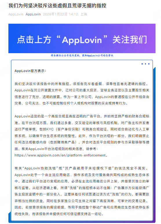 1月22日,針對此前沽空機構Capitalwatch發布的沽空報告,AppLovin方面回應稱,堅決駁斥該報告中的所有指控。該報告充斥着虛假、誤導性且毫無邏輯的指控。AppLovin在其公開披露文件中,已對公司的重大投資、全球業務運營以及主要股東相關信息進行了充分、透明的披露。作為一家上市公司,AppLovin的普通股在公開市場自由交易,公司無法、也不可能控制任何個人或機構對股票的買賣或持有行為。