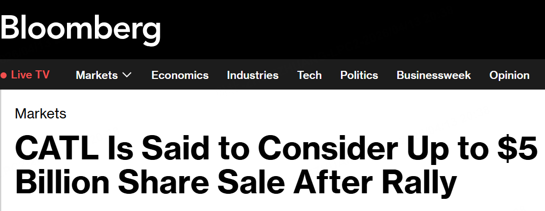 4月13日,據知情人士透露,寧德時代正在考慮在香港出售股份籌集最多50億美元資金。這幾位知情人士表示,寧德時代已就此次配售與銀行進行了初步談判。寧德時代也在考慮發行可轉換債券,以滿足部分孖展需求。目前相關考慮仍在進行中,尚未做出最終決定。(彭博)