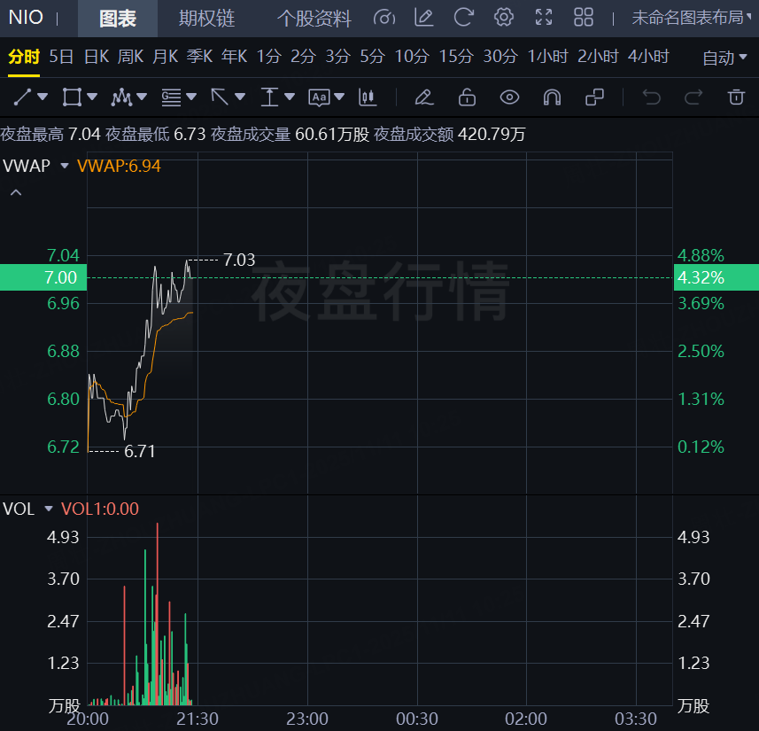 11月11日,美股夜盤時段,中概新能源汽車股齊漲,小鵬汽車、蔚來漲超4%,理想汽車漲1.5%。