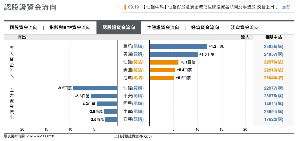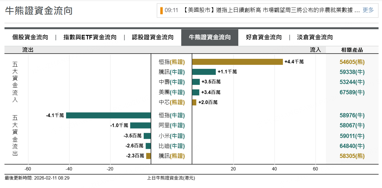 恒指熊證上日流入4400萬元,騰訊牛證流入1100萬元,中壽牛證流入350萬元。