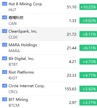 10月10日(週五),美股加密貨幣概念股盤初活躍,Hut 8漲超10%,嘉楠科技漲超9%,CleanSpark漲超8%,MARA Holdings漲超6%,Bit Digital、RIOT漲超4%,Circle漲超3%。