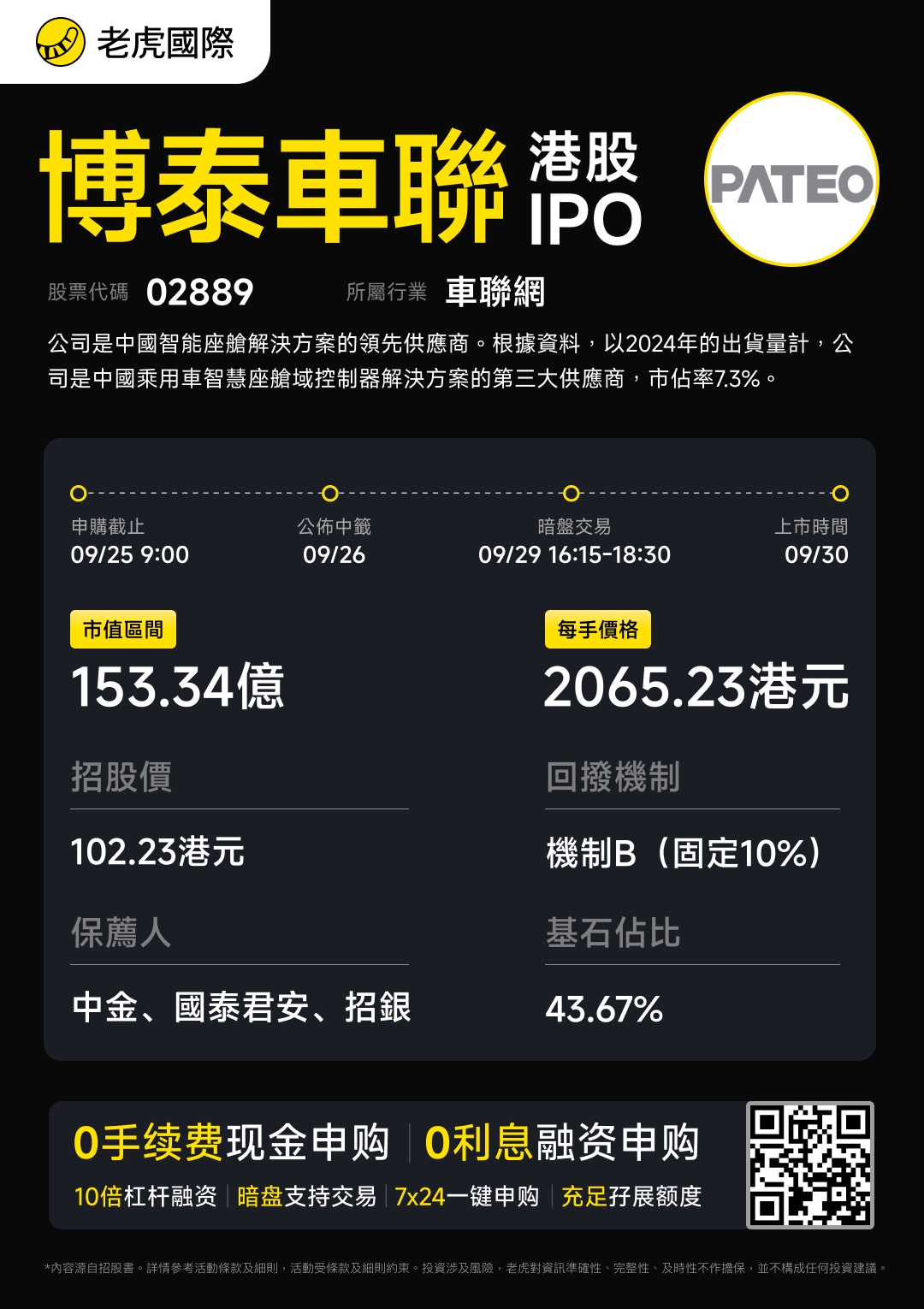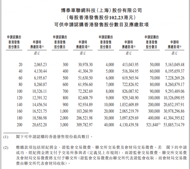 中國智能座艙解決方案供應商 博泰車聯 (02889)今日起至週四(9月25日)招股,發售1043.69萬股H股,香港公開發售佔10%,其餘爲國際配售,每股招股價102.23港元,集資最多10.67億港元該股預期9月30日掛牌。聯席保薦人包括中金公司、國泰君安、招銀國際、華泰國際及中信証券。