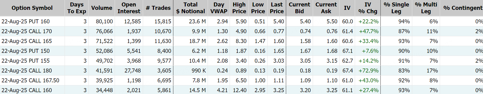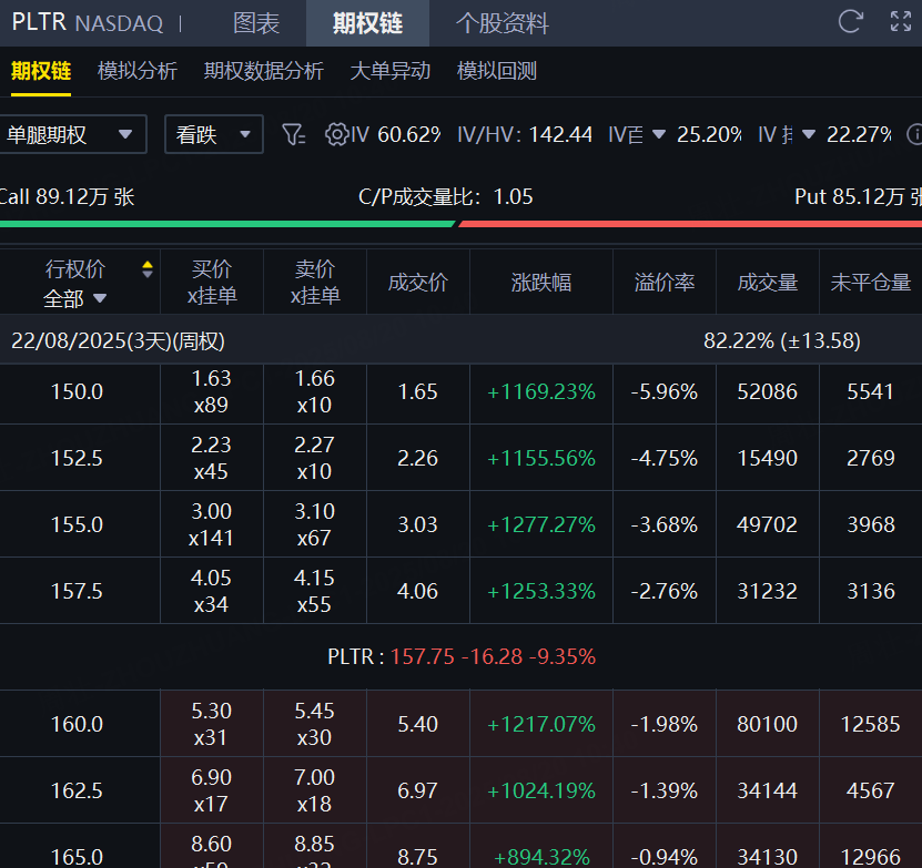 期權方面,Palantir當日期權成交174.24萬張,環比前一交易日激增逾150%,其中於8月22日到期的160美元行使價的看跌期權成交居前,成交超8萬張;此外,從期權鏈上看,Palantir 8月22日到期的多張Put單飆漲逾1000%。 $PLTR 20250822 160.0 PUT$ $PLTR 20250822 150.0 PUT$ $PLTR 20250822 155.0 PUT$
