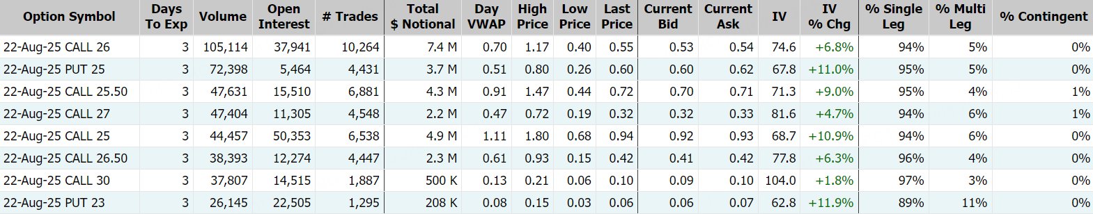 期權方面,英特爾當日期權成交155.74萬張,環比前一交易日增超53%,看漲期權佔比69.2%,其中於8月22日到期的26美元行使價的看漲期權成交居前,成交超10萬張。 $INTC 20250822 26.0 CALL$