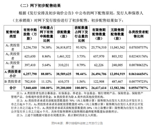 其中,公募基金、社保基金、養老金、年金基金、銀行理財產品、保險資金、保險資產管理產品、合格境外投資者等A類投資者獲配約3858.96萬股,佔網下最終發行比例的98.44%,私募、券商資管、券商自營等B類投資者獲配1.56%,從具體獲配股數來看,有的B類投資者最少只獲配了31股。